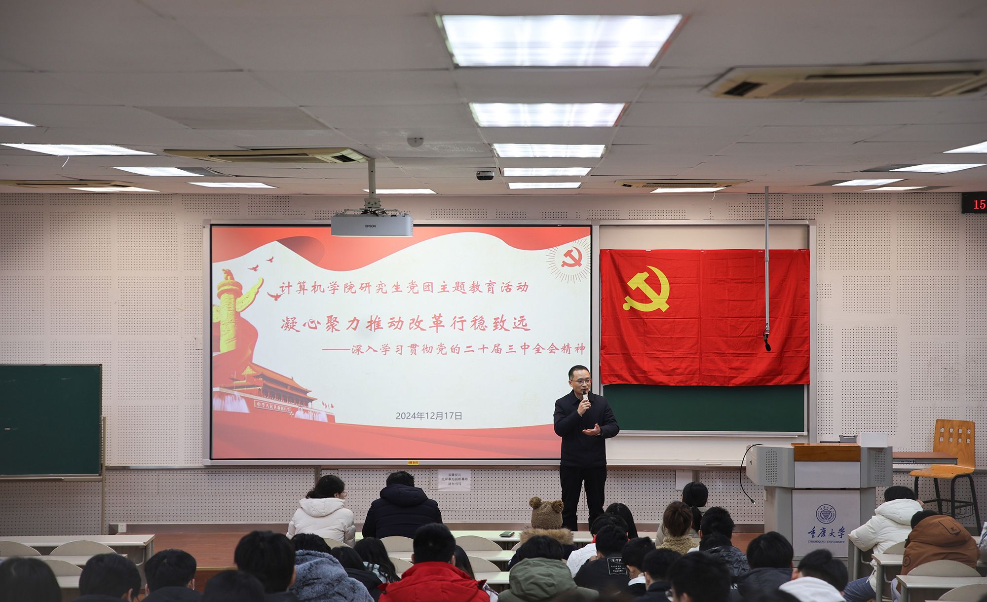 为深入学习贯彻党的二十届三中全会精神,加强研究生党员、团员的思想政治教育,太阳集团tyc4633于2024年12月17日在虎溪校区D1125教室举办了“凝心聚力推动改革行稳致远”研究生党团主题教育活动。公司党委书记杨守鸿、副经理郭松涛应邀参加活动,研究生辅导员张军、袁曦以及全体研究生党员参加学习。会议由学院研究生二党支部书记、研究生分团委书记李怡蕊主持。